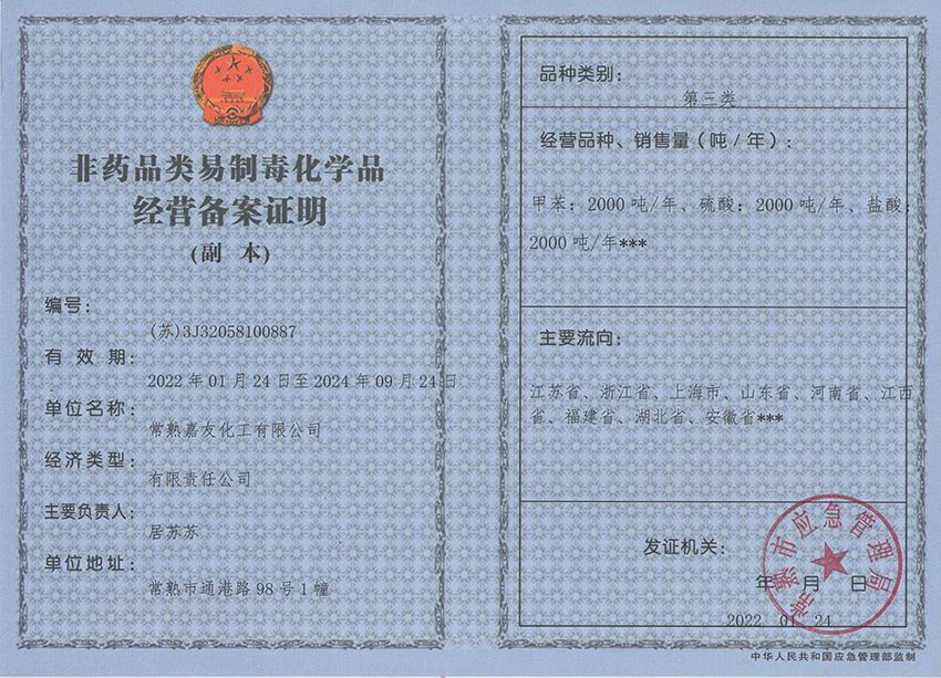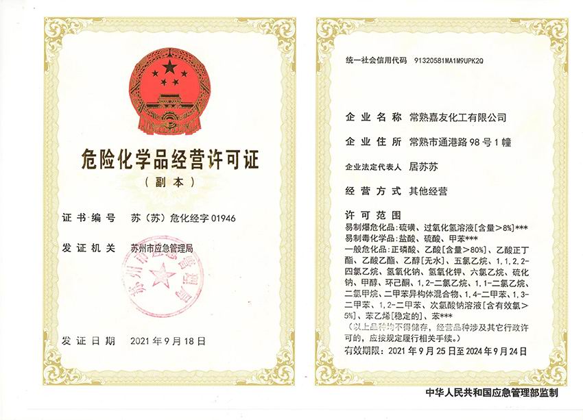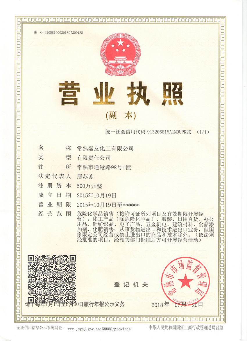 常熟嘉友化工有限公司位于江苏省常熟市,地处交通要道,服务于江浙沪区域,2015年成立至今,业务快速增长,短短数年间,成为水处理药剂行业出色供应商,为周边各大造纸企业、水处理公司及印染纺织行业提供产品和方案。公司始终以客户至上、服务至上的原则服务好每一位客户。